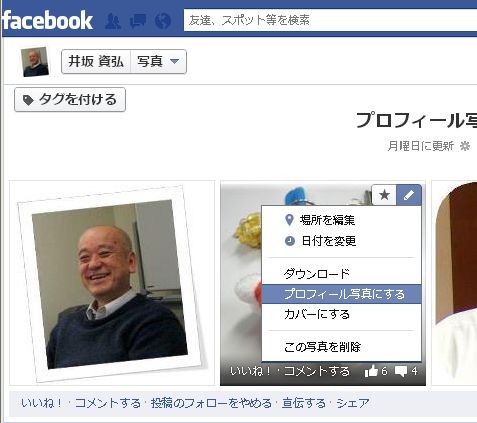 自分のタイムラインでプロフィール画像をクリックすると写真のホルダが表示されます。その中の画像の右上にマウスを持っていくと、プロダウンメニューが表示され、そこからプロフィール写真として使うを選択すれば良いようです。