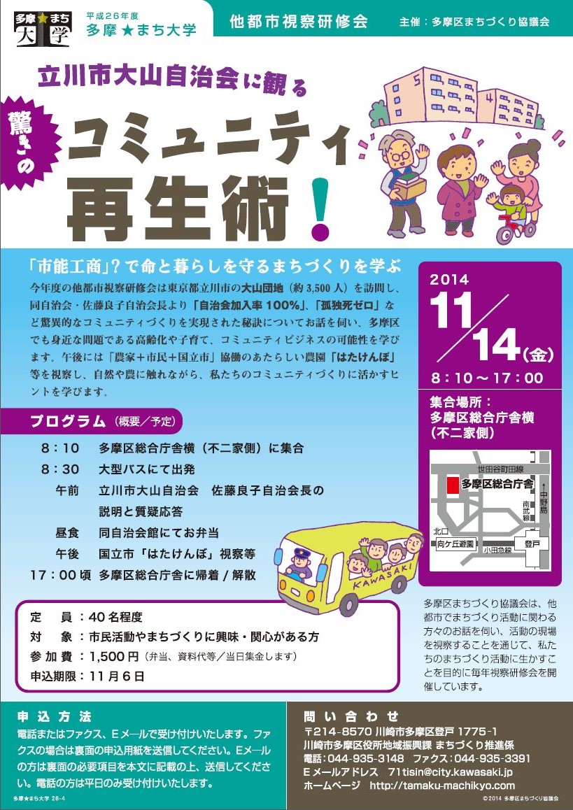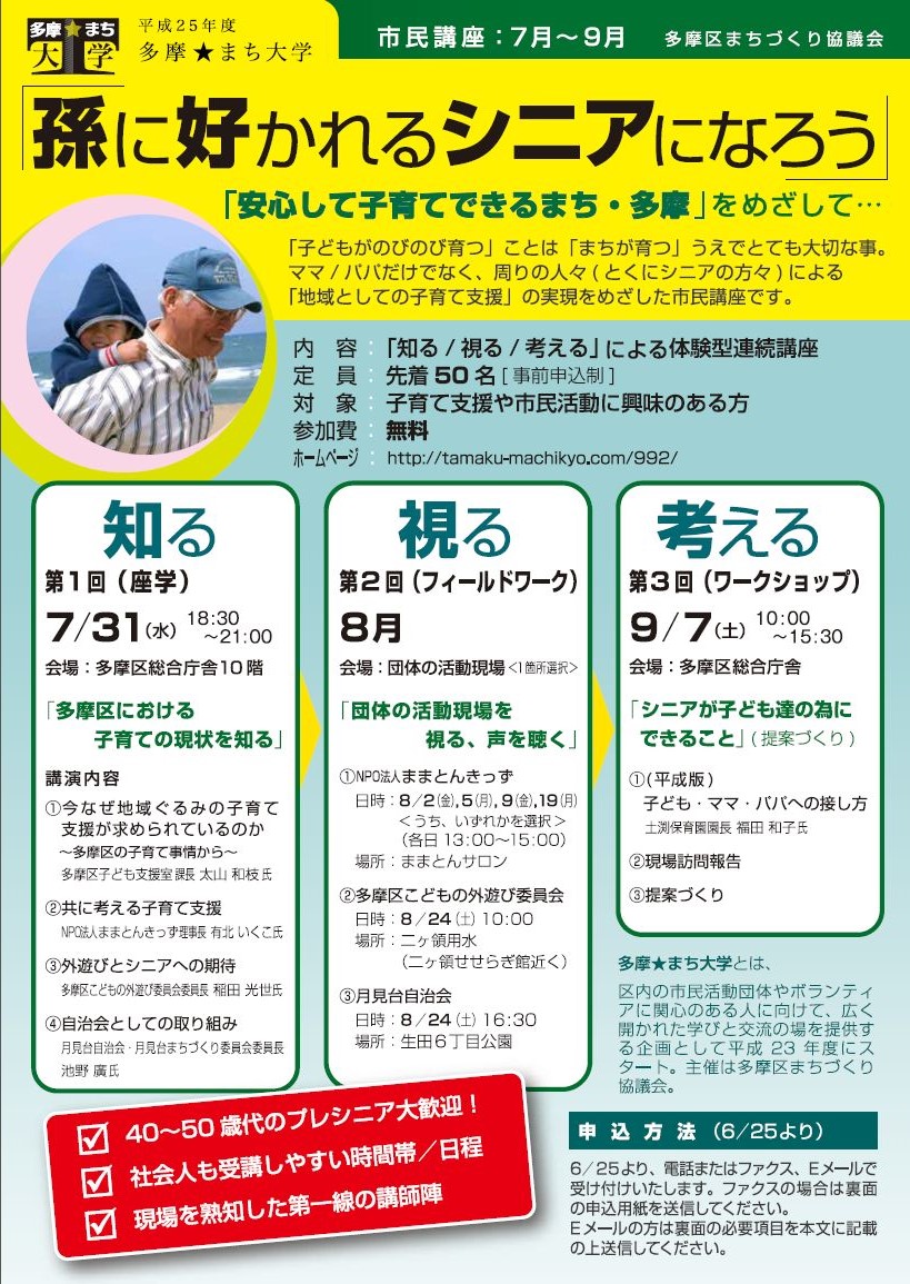 平成23年度 多摩★まち大学 第1回研修会 「最近のインターネットと市民活動を知る」 Tweet 関連チラシ: 平成23年度 多摩★まち大学 第2回 視察研修会「練馬区と三鷹市のまちづくりの現場を観る」 平成25年度 多摩★まち大学「孫に好かれるシニアになろう」 みた・まちもりカフェ通信2015年1月 多摩★まち大学2015第3回「ゴーヤの育て方講習会」 入浴剤を作ってあわの正体を勉強しよう