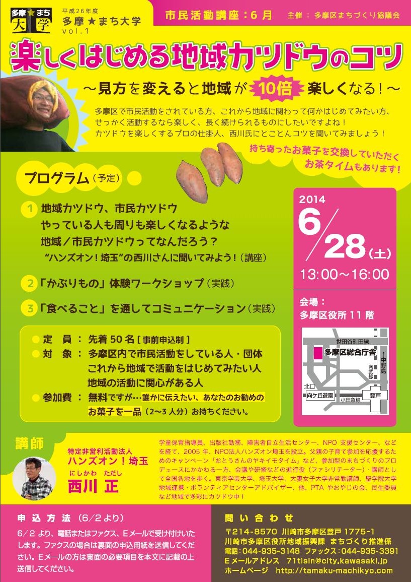 平成26年度 多摩★まちCafe 『歴史カフェ』 親子で知ろう!多摩のヒストリー Tweet 関連チラシ: 平成26年度 多摩★まち大学「楽しくはじめる地域カツドウのコツ」 まめな人生通信No.25 まめな人生通信No.26 まめな人生通信No.27 平成25年度 多摩★まち大学「孫に好かれるシニアになろう」