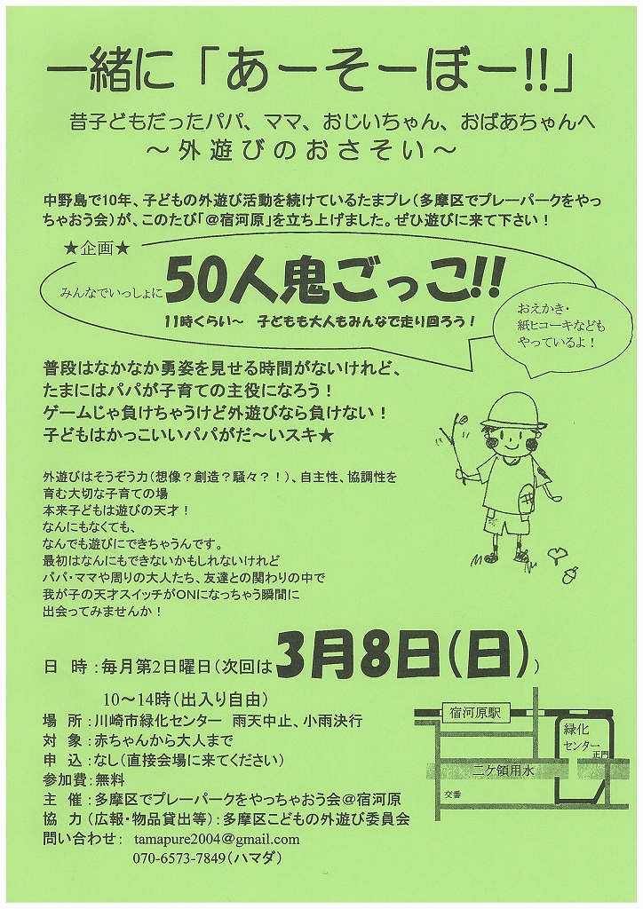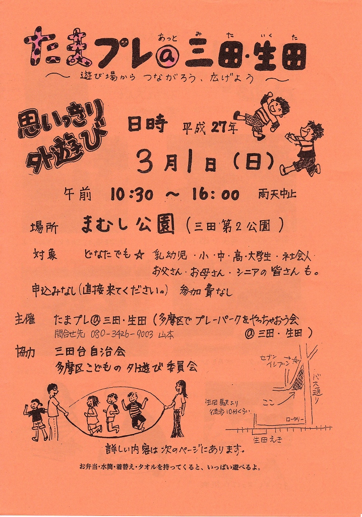 たまプレ@三田・生田 ~遊び場から つながろう、広げよう~ Tweet 関連チラシ: やきいも交流会(2015年3月1日) 一緒に「あーそーぼー!!」~外遊びのおさそい~ みた・まちもりカフェ通信2015年1月 まめな人生通信nо.29(2015年2月・3月号) 町内会・自治会に参加しませんか!