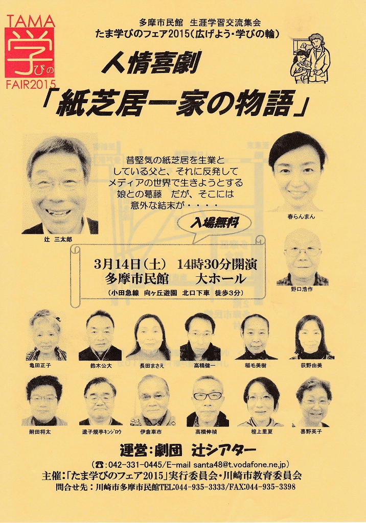 たま学びのフェア2015(広げよう・学びの輪) 人情喜劇『紙芝居一家の物語」 Tweet 関連チラシ: ドイツのボードゲームであそんで まなぼう! シニア”1日囲碁講座” 入浴剤を作ってあわの正体を勉強しよう 多摩の文化財めぐり(2015年4-6月) 多摩★まちCafe 「カフェde折り紙」